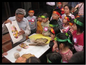Ông giảng giải "Giấy để vẽ tranh Đông Hồ gọi là giấy dó – giấy được làm từ vỏ cây dó lấy ở rừng về. Màu sắc của tranh Đông Hồ đều được làm từ những chất liệu thiên nhiên: Màu đen từ than lá tre, màu xanh từ lá Tràm, màu vàng từ hoa Hòe, màu đỏ làm từ bột sỏi son...’’. Tranh được in bằng các bản khắc gỗ – có những bản khắc đã hơn 500 tuổi rồi đấy! Một bức tranh in bao nhiêu màu thì cần từng ấy bản khắc gỗ và phải chờ cho mực thật khô thì mới có thể in màu mới được. Để làm một bức tranh Đông Hồ, thật là công phu phải không các bạn?